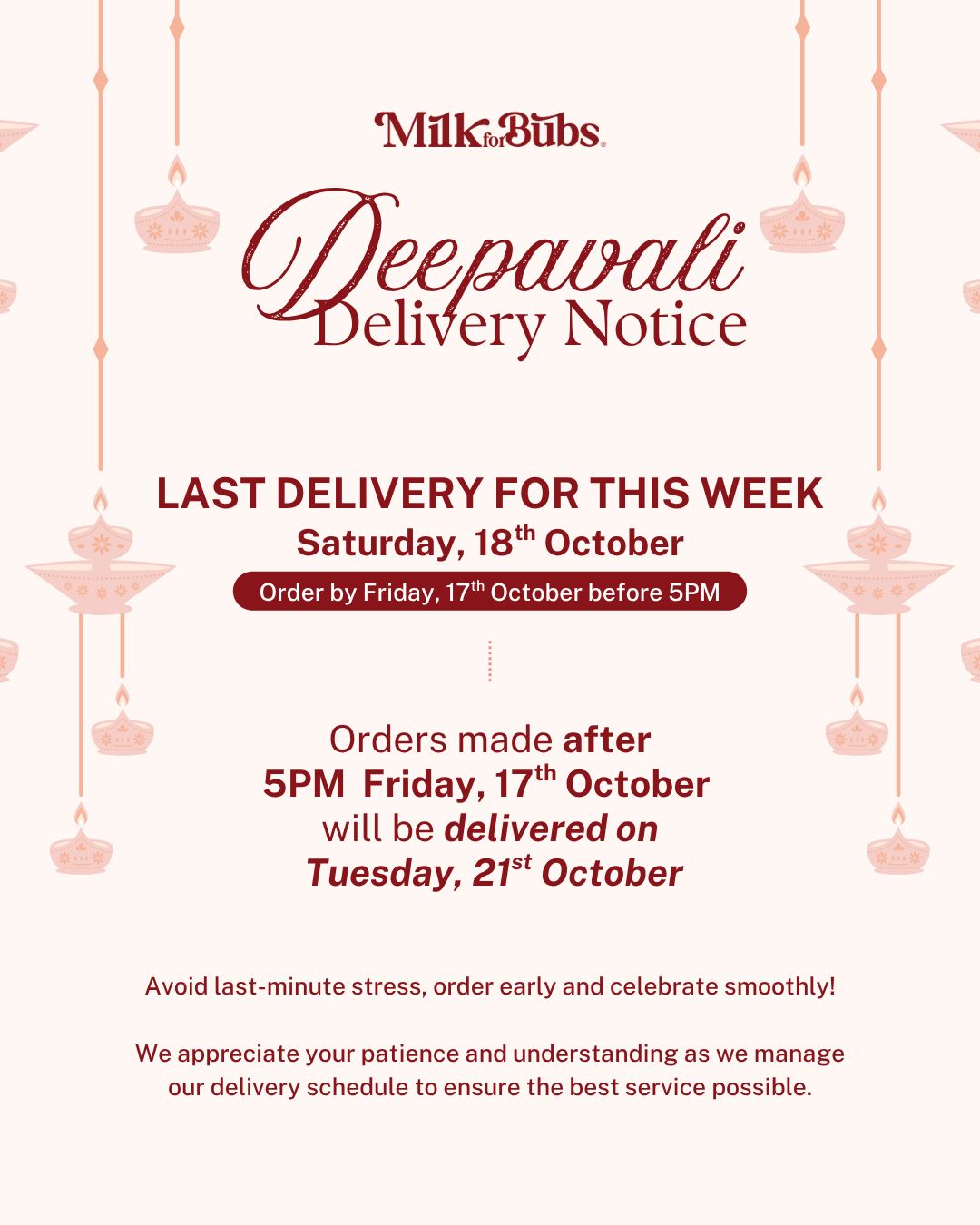 Order before 5pm, deliveries run Monday-Saturday except public holidays