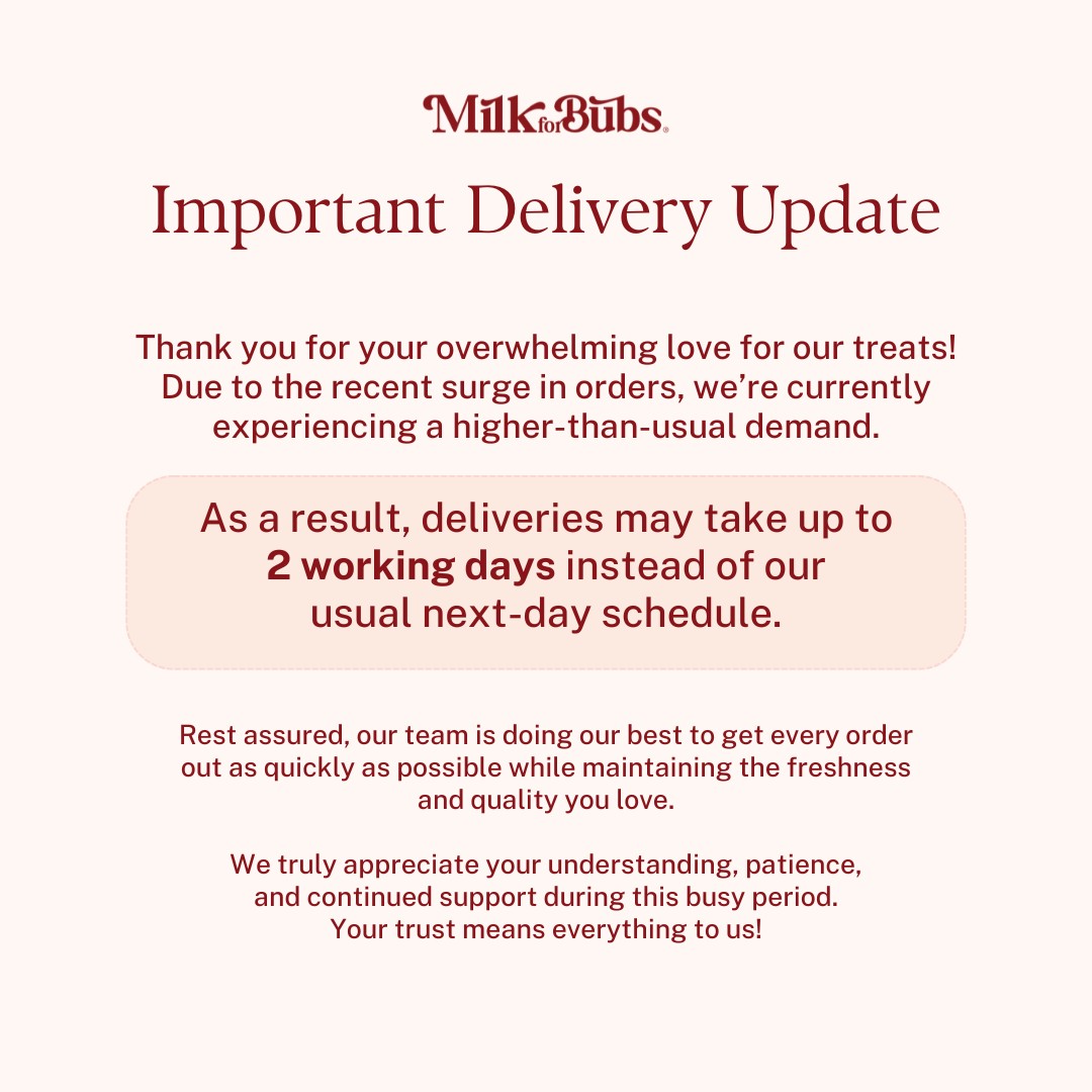 Additionally, we want to reassure you that our treats, such as cookies, granola, and brownies, are safe to be kept outside in ambient temperatures. These items can maintain their freshness and quality for up to 1-2 weeks when stored properly at room temperature. This means you can confidently receive your delivery during our standard window and enjoy your treats at your convenience.